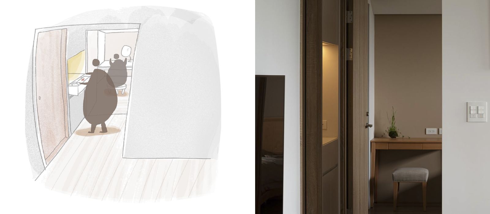 通往私領域的廊道上,規劃備品櫃收納客浴衛生用品、醫藥箱,也有小夜燈和展示的檯面豐富廊道風情。廊道盡頭是主臥室的梳妝台,小巧的桌椅結構是別致的象徵性端景。