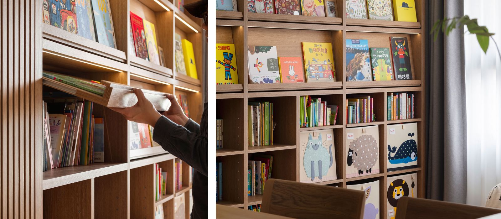 在客廳沙發區對牆規劃整面書櫃牆,功能兼具收納與展示,能擺放旅遊紀念品、兒童書籍與玩具。上下部皆為開放式收納架,中段是站立時平視的高度,可以像書店、圖書館般展示書本封面,提供策展樂趣,也有助彙整公益捐贈圖書。