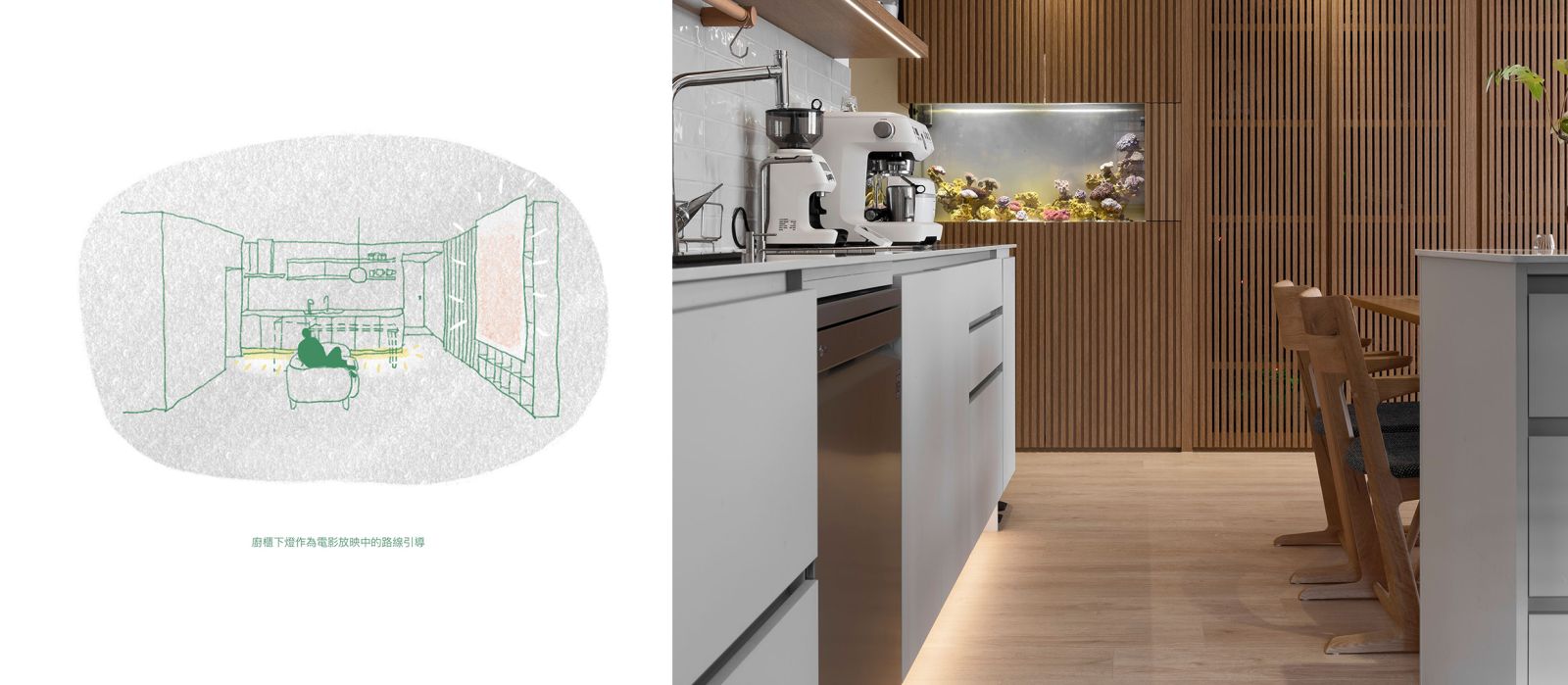 廚房規劃為開放式,除了能串連客、餐廳,放大公共區的空間感,也能在使用投影幕放映的全遮光環境,借助廚房流理臺下櫃的間接照明,如同電影院走道區微光,是氛圍燈,也更方便取用飲食酒水。