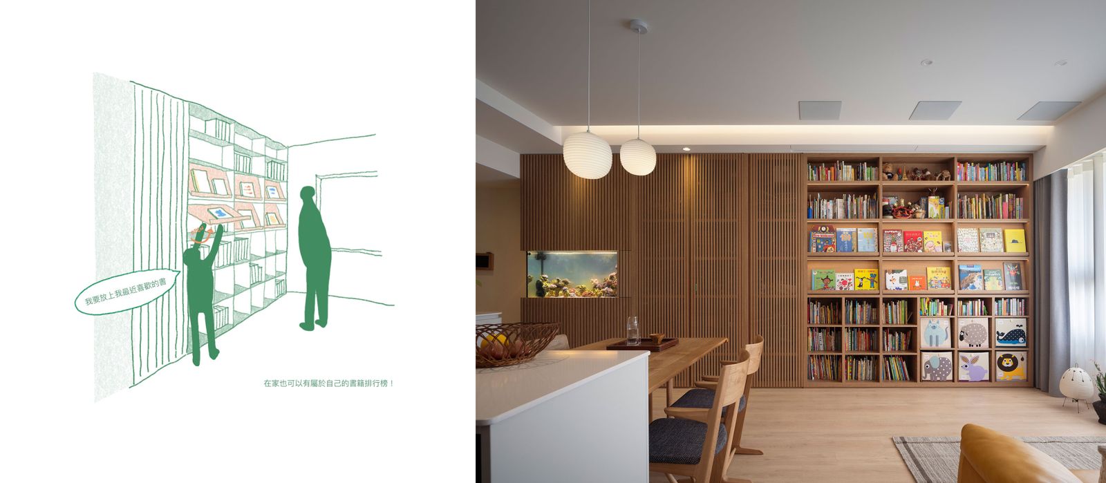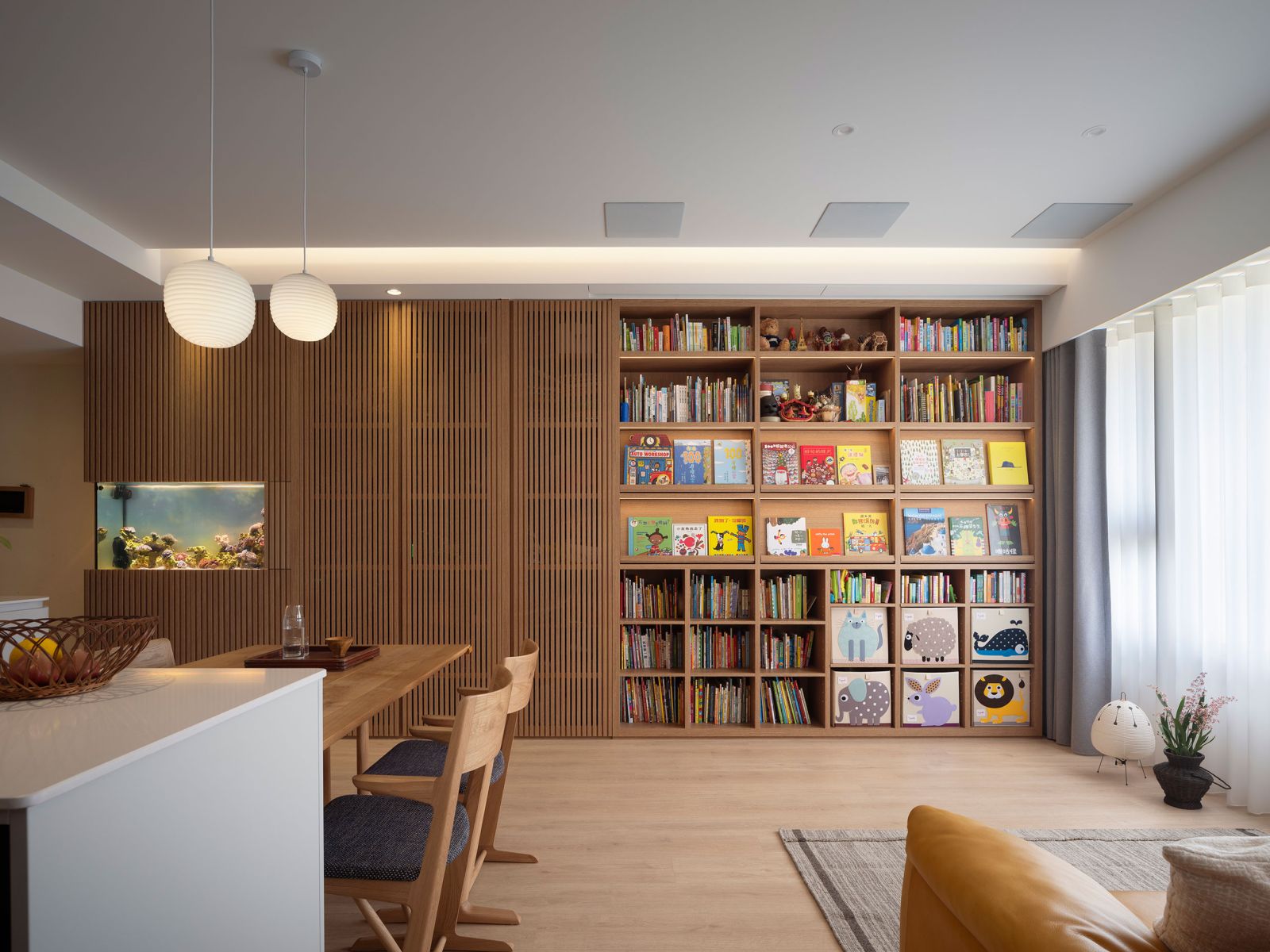公區底牆從玄關口延伸一整面共構海水魚缸與兒童圖書的展示收納櫃,因量體承重很可觀,也必須方便儲放童書,層板厚度、跨距分割經過精密計算與加強強度。這道書櫃牆亦可弱化樑柱的量體感,搭配間接照明柔和整體空間氛圍。