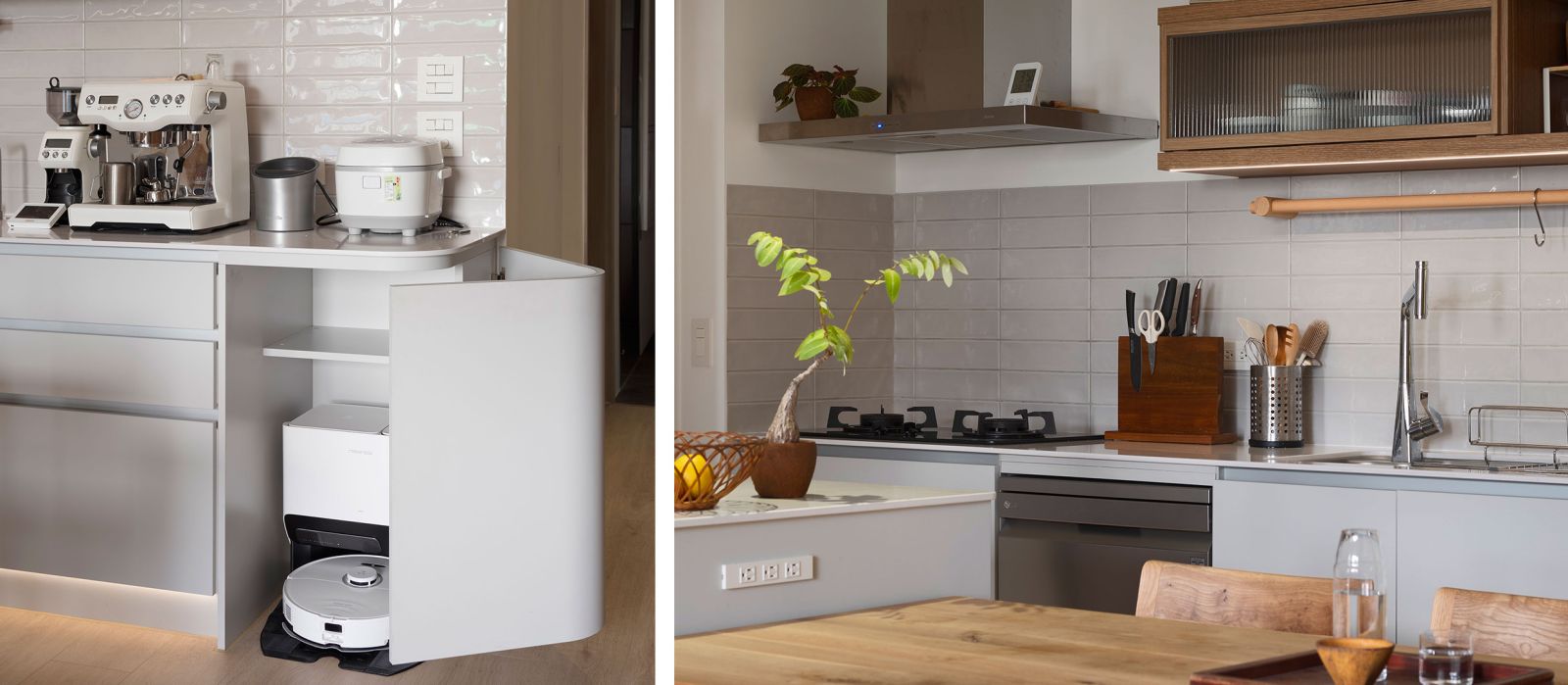 長型賽麗石檯面可擺放各式小家電,櫃體下可停放掃地機器人。中島與木餐桌共構成T字型,中島下方藏小酒櫃,這道廚房與餐廳的中介可定義區塊,也可以讓雙邊共用機能,放大生活感。