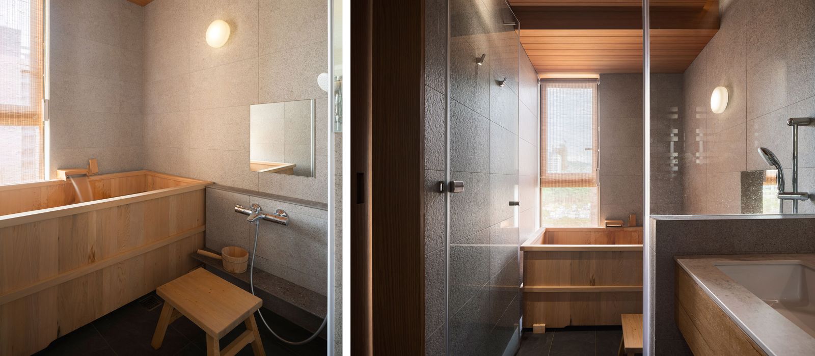 訂製檜木泡澡桶設在窗邊,出水閥皆用檜木包覆,有保溫效果。壁面搭配鑿面板岩磁磚,當蒸騰的水氣接觸到香杉天花板,熱氣蒸出木頭芳香氣味,泡澡時滿室馨香,結合日式接水盆、木竹捲簾、壁燈,營造出原汁原味的日本澡堂風情。