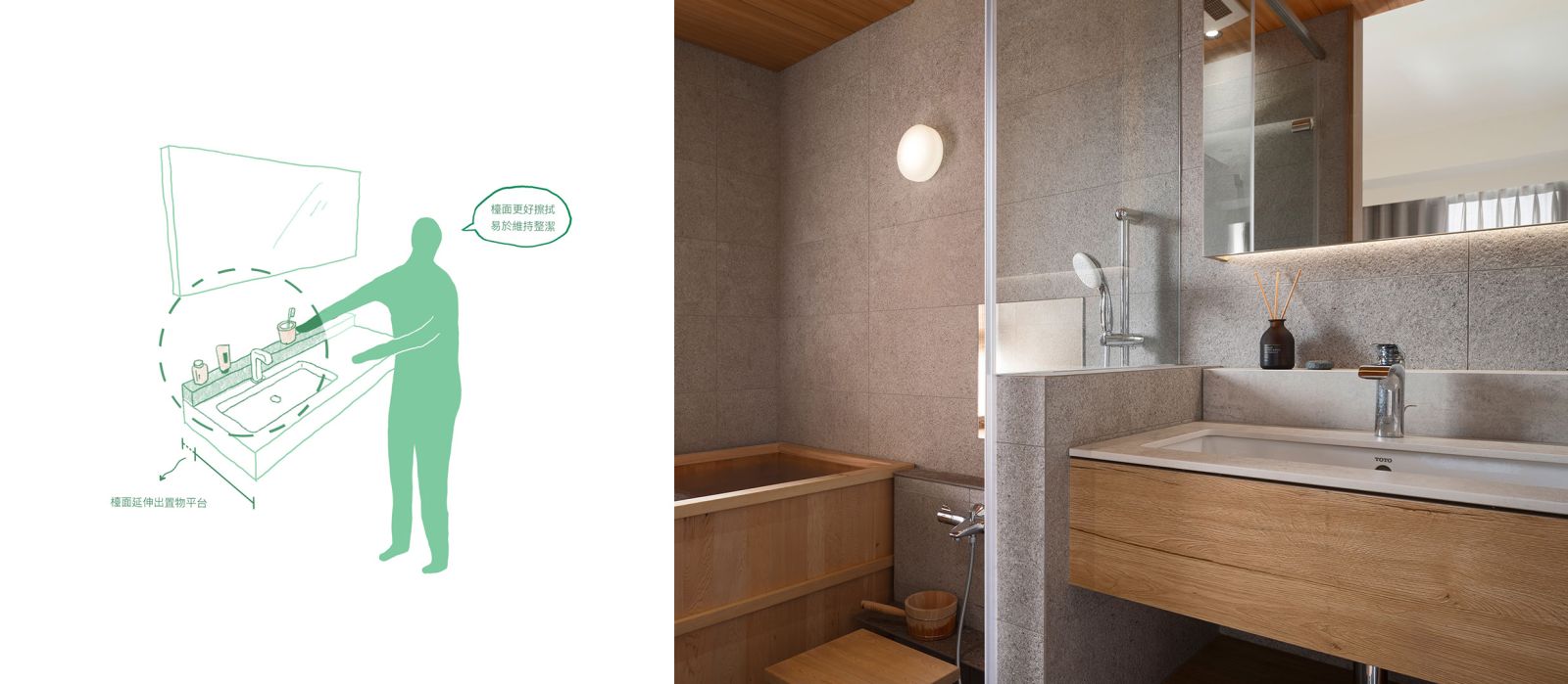 打開木門進入主衛浴,獨立馬桶、盥洗與沐浴三種機能,右方貼牆角落設置馬桶,一旁是洗手矽剛石檯面及其橡木拉門櫃,內部是淋浴泡澡區,不妨礙同時使用衛浴。