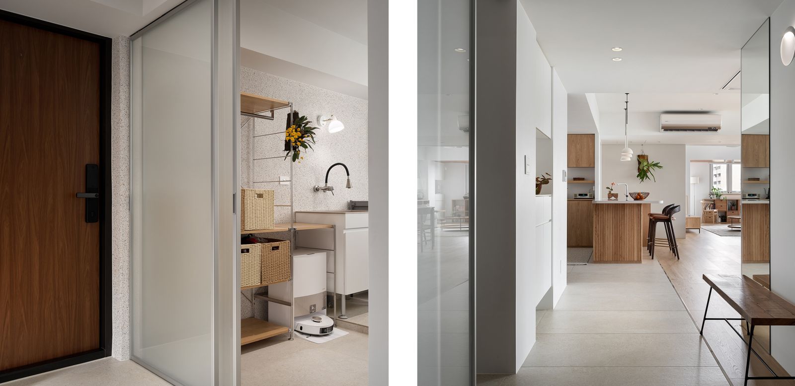 拉長玄關動線,回家後順其自然地進行例行性事務,如:換拖鞋、放置包包、卸除外衣等,居住者可在循序漸進的動作中切換休息心態,並用深玄關營造大坪數的體感。