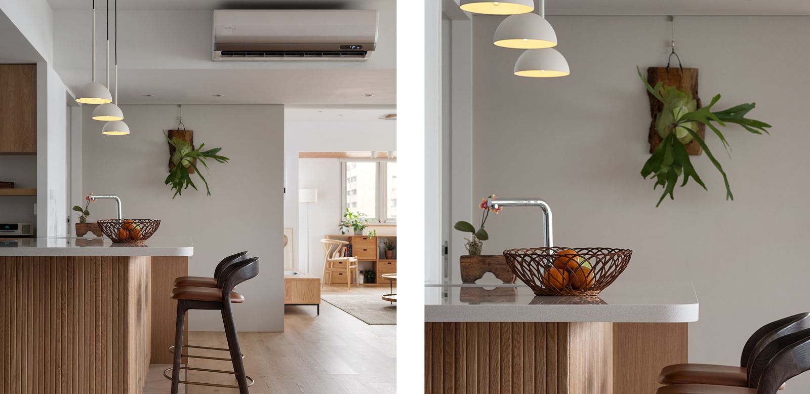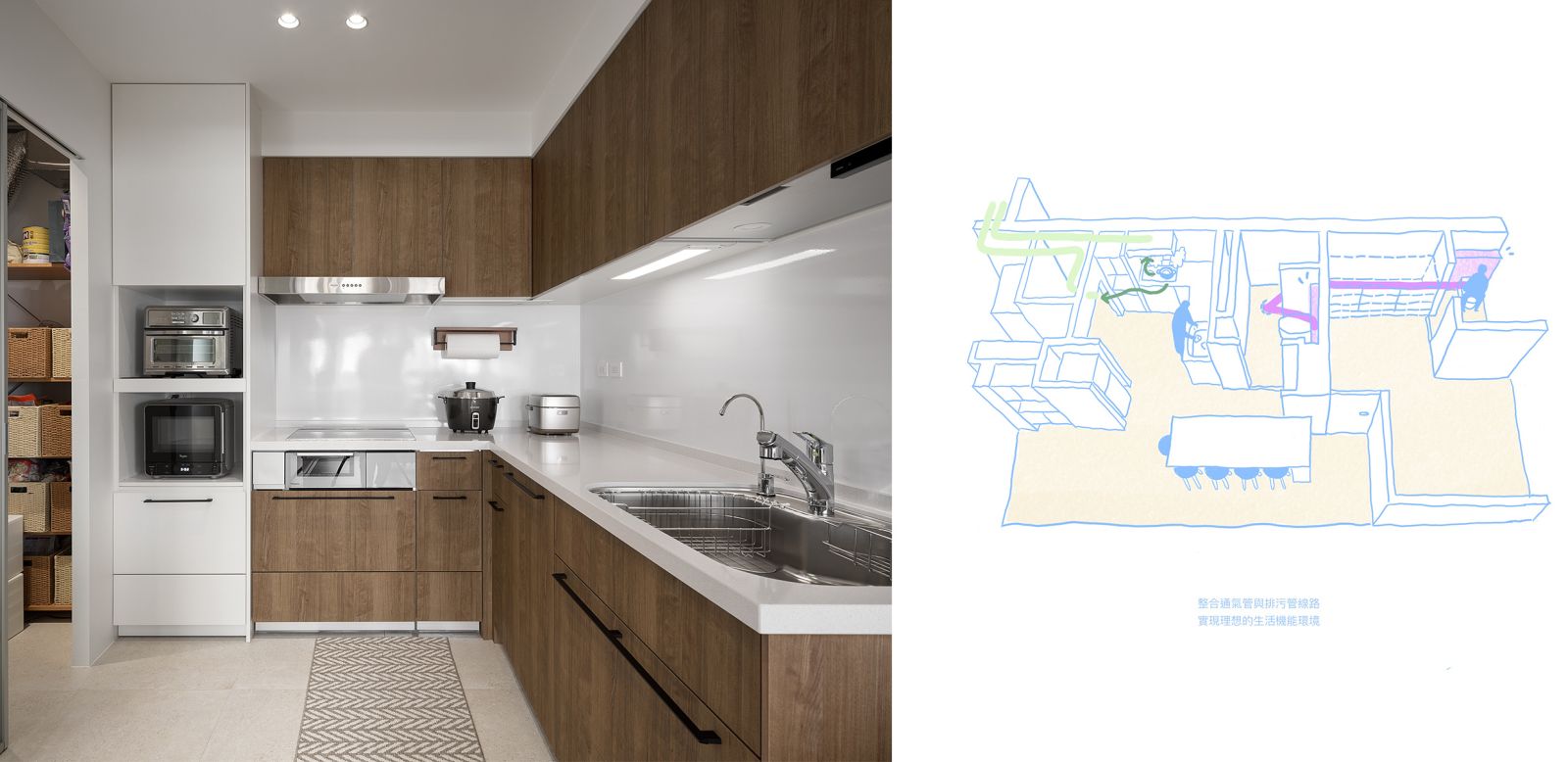劃分內廚、外廚,重油污水槽置於內廚,中島吧台水槽則用於飲用水、簡單清潔杯盤或蔬果。開放式客餐廳讓下廚者不致於被關在廚房裡,擁有更多和家人互動的機會。