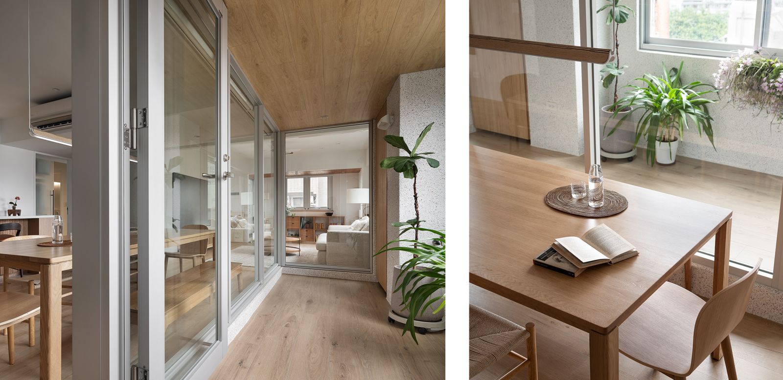 橡木色木質元素不僅廣泛用於家具、地板,也應用在陽台的天花板與地板,藉由同樣的木材語彙聯通內外部,延伸雙邊空間感。