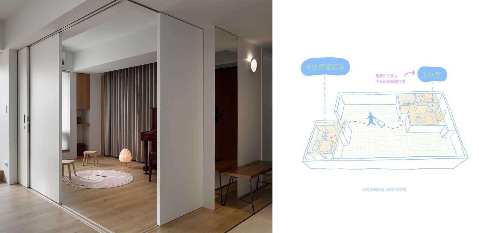 靠近玄關大門角落規劃一方多功能區,複合遊戲室、琴房、工作室、小客房等機能。活動式門牆設計可隨需求拉上區隔成小房間,日後可作為另一間孩子房,亦可作為客房使用。對機師男主人而言,需要半夜出門時也可在此小憩,不怕影響孩子和太太休息,可視為居家小型過境旅館。