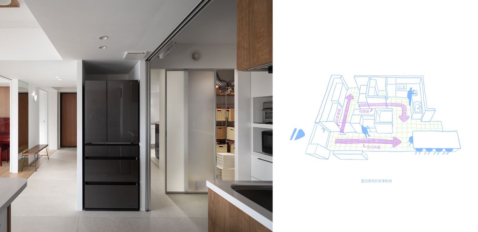 從玄關入門後,可直通中島吧台整理生鮮蔬果,或是轉入家事工作間收納雜物、盥洗與烘乾衣物,再走入聯通的雙入口廚房。這條家事工作動線地面採用好清潔的磁磚,不同於客廳的木地板,即使下雨天購買大包小包的雜貨回家,也能安心地迅速歸類。